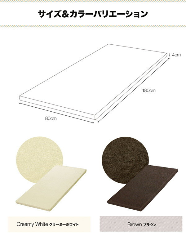 来客用に最適! お問合せはこちら ※[店舗管理用 URL]a11538※[品番]【ブラウン:a11538】【クリーミーホワイト:a11539】持ち運びもラクラク!ちょっとした時のリラックスタイムに! 低反発マルチマットレス 80x180x4cm【2カラー】 商 品 詳 細 カラー ・クリーミーホワイト ・ブラウン サイズ (約)80cm×180cm×4cm 材質(マットレス) 1cm低反発ウレタン / 3cm高反発ウレタン 材質(カバー) ポリエステル100% 重量 (約)2.1kg 特記事項 ※圧縮梱包されたままの状態で長期間保管した場合、マットレスが復元できなくなってしまいます。