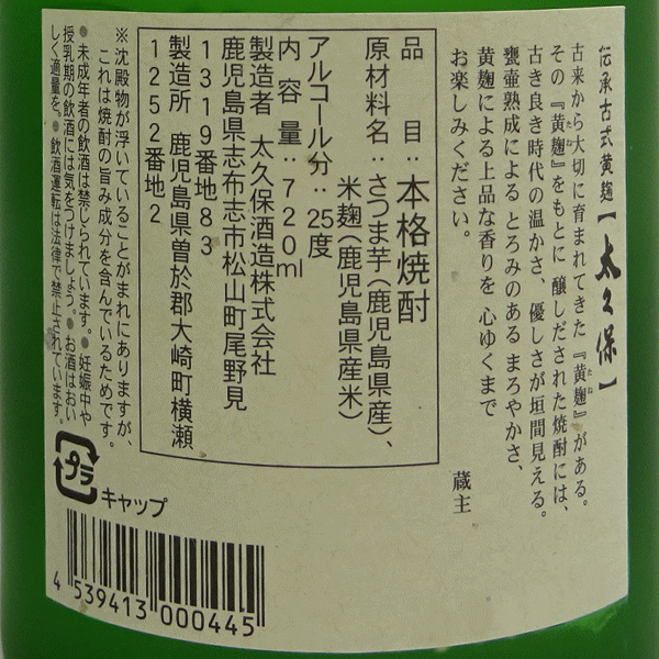 「太久保」裏ラベルより ●開栓時には充分ご注意下さい。